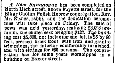 This building was sold to B’nai Israel Congregation in 1878, when Bikur Cholim dedicated its new home on September 20, 1878, at 207 N. High St. (previously 53), between Low & Lexington. At this time, the congregation had 45 members. The sale of pews realized a “$3,098 premium, the choice seat bringing $127.”
