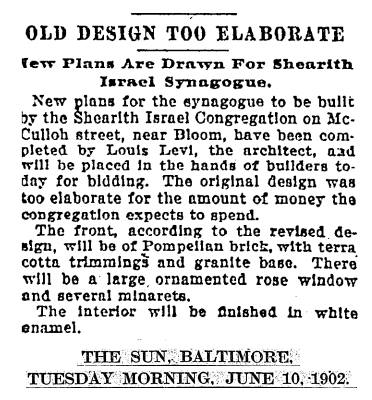 Courtesy of Fred Shoken, local historian: “The original design [of Shearith Israel] was a bit more elaborate. The Baltimore Sun printed an elevation of the proposed design on November 27, 1901 and stated it was to be built of granite with two towers and tile roofs. This would have been reminiscent to some degree of nearby reform temples of Oheb Shalom on Eutaw Place and Baltimore Hebrew on Madison Avenue. But the plan proved to be too expensive to build. A little over six months later, the Sun printed a brief article that the revised design was of Pompeiian brick. When comparing what was built to the original design, in addition to less expensive materials, the towers were also reduced in size leaving two minarets to flank the central bay. Also it should be noted that a Jewish architect, Louis Levi, was responsible for the design. Most of the other German congregations had designs prepared by Joseph Evans Sperry.