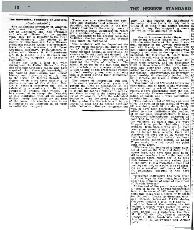 Rabbinical Seminary of America, Incorporated in Baltimore, 1914, Rabbi Shepsel Schaffer. This yeshiva was intended to be a version of the Hildesheimer Yeshiva in Berlin, graduating Orthodox boys in the “Rabbi Doctor” model – rabbis with college. It was open for a very short time. Ner Israel would open 19 years later in 1933.