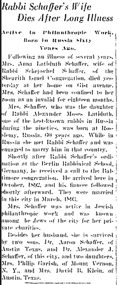 It was not uncommon for German Orthodox families to marry into Reform families, as the pool of eligible Jewish singles was not large. One of Rabbi Schaffer’s sons, Dr. Alexander Schaffer, was married to Ruth Hutzler, daughter of Louis S. Hutzler, of department store fame. Louis was the grandson of Moses Hutzler, an original founder of the reform Har Sinai Congregation.