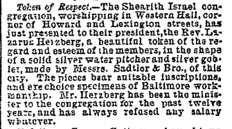 Still, Earl Pruce makes note that “about 1850, following a disagreement concerning holding Sunday morning services, some members of Har Sinai left the congregation and formed an independent on in a rented hall at Gay and Front Streets. … members [returned] to Har Sinai after about six months.”